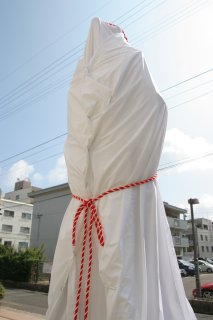 幕で覆われた父子像